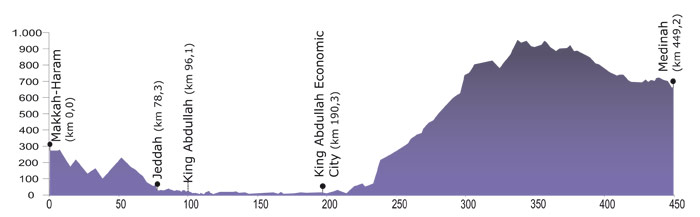 La línea de alta velocidad entre Medina y la Meca tendrá una longitud de 450 kilómetros y será apta para 300 km/h. Incorporará el sistema de regulación de tráfico ERTMS Nivel 2. Tendrá cinco estaciones: La Meca, Jeddah, Aeropuerto de Jeddah, KAEC (siglas en inglés que responden a Ciudad Económica del Rey Abdullah) y Medina. Las autoridades saudíes están considerando añadir dos estaciones más: una en una universidad y otra en la denominada Ciudad del Deporte, situada en pleno desierto. Su diseño es parecido, pero todas poseen alguna característica distintiva. Hay que resaltar, además hay que destacar que las estaciones se encuentran emplazadas fuera de la zona prohibida a los no musulmanes. Hay que tener en cuenta que se trata de construir una línea de alta velocidad en pleno desierto, donde las temperaturas oscilan entre cero y cincuenta grados, de ahí su dificultad técnica. Uno de los problemas que pueden plantearse es la arena. Hay dos zonas, concretamente entre los kilómetros 17,5 y 39, y entre los kilómetros 147 y 227, que pueden presentar problemas especiales en este sentido. En los puntos más problemáticos –unos treinta kilómetros- se hará vía en placa y se construirán muros para evitar que la arena invada la vía. En cuanto a la demanda estimada, se calculan 166.000 viajeros diarios, con puntas de 180.000 al año. Los viajeros representarían una cifra de 74 millones en el primer año de explotación, y más de mil millones de viajeros durante los doce años del contrato, según las estimaciones de las autoridades saudíes.