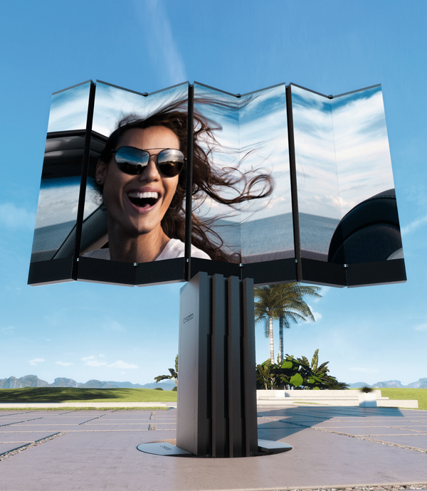 Basta con accionar un botón del mando a distancia para que en 15 segundos se levante una torre de 4,65 metros de altura de la que se desplegará una inmensa pantalla compuesta de siete paneles, transformando el espacio donde está en una impresionante sala de proyecciones. Es entonces cuando puede descubrirse las 201 pulgadas (nada menos que 5,11 metros) y el brillo que aportan los 780.000 LEDs, cerca de diez veces superior al de una pantalla de televisión convencional –lo que permite disfrutar de su visión a plena luz del día– y su resolución ultra, con 281 billones de colores radiantes.