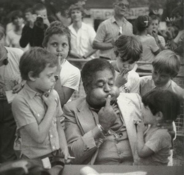El trompetista Dizzy Gillespie muestra a los niños cómo infla sus mejillas en un festival de jazz. Francia, 1981