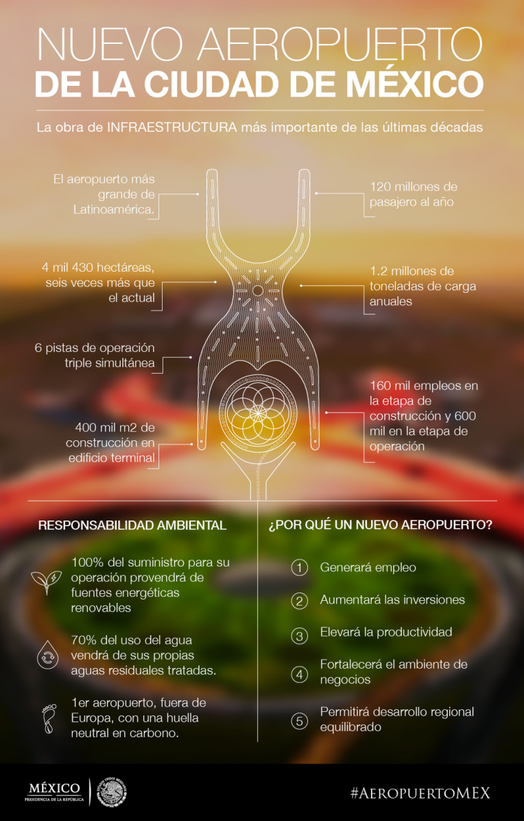 El proyecto ganador, ubicado en un terreno de 555,000 m2, se basa en la máxima conectividad, en brindar cortas distancias de recorrido y hacer los mínimos cambios de nivel. Su diseño tiene una escala monumental inspirada en la arquitectura y el simbolismo mexicano y busca minimizar el impacto ambiental al involucrar sistemas de construcción de acuerdo a las condiciones del terreno. Está pensado para alcanzar el certificado LEED Platinum, calificándolo en el futuro como el primer y más sustentable aeropuerto del mundo.