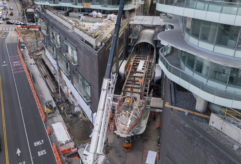Ponen un avión Boeing 747 entre dos rascacielos de Denny Triangle Seattle